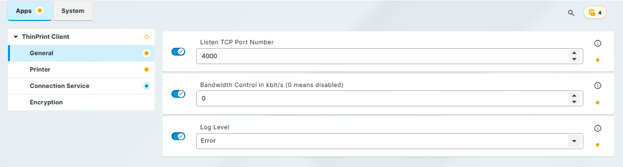 - Im Listen TCP Port Number-Feld können Sie einen spezifischen TCP/IP-Port festlegen, an welcher der ThinPrint-Client auf eingehende Druckdaten wartet. Die Standard-Portnummer ist 4000.