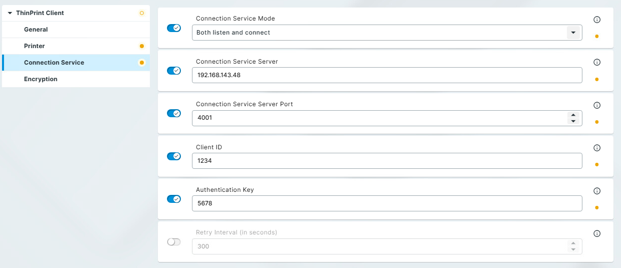 - Falls die Verbindung zwischen dem ThinPrint Client und dem Connection Service unterbrochen wird, versucht der ThinPrint Client standardmäßig nach 300 Sekunden erneut, die Verbindung aufzubauen. Sie können dieses Intervall im Feld Retry Interval individuell anpassen.
