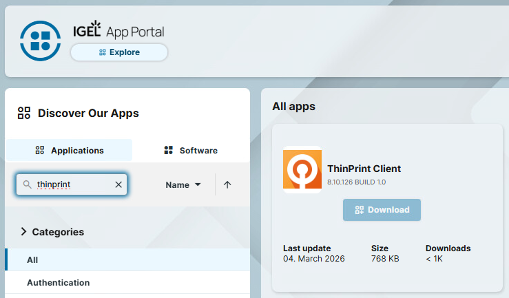 - Um den ThinPrint Client lokal zu installieren, öffnen Sie das IGEL App Portal auf dem IGEL OS 12 Gerät.