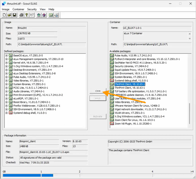 - Mark the ThinPrint Client package and click on the <== arrow to install it under Defined packages.