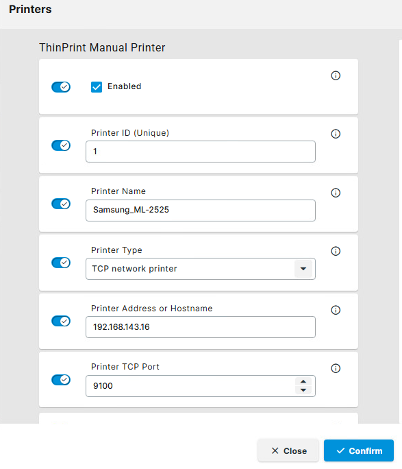In the Printer menu you can add new printers or edit existing ones. To add a printer click on the + button which will open the ThinPrint Manual Printer menu.