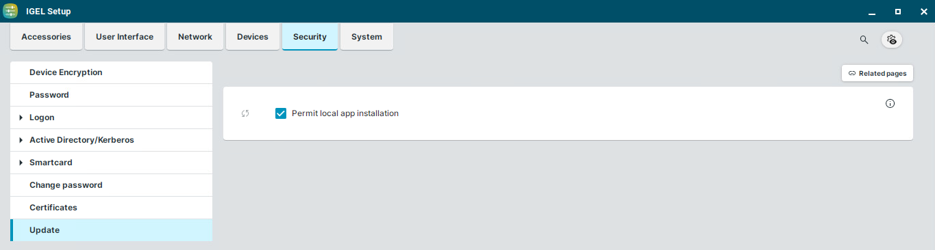 The local installation of ThinPrint Client IGEL OS 12 requires permission to install applications locally. To permit the local app installation navigate in the IGEL Setup to Security -> Update and check the Permit local app installation checkbox.